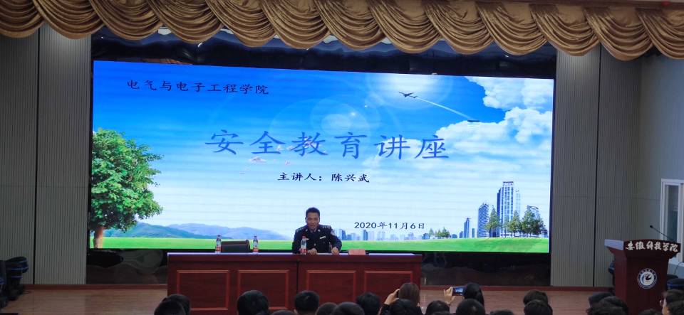 为提高新生安全意识,进一步保障学生人身、财产安全,11月6日下午2点,电气与电子工程学院于敏行楼A栋报告厅开展安全教育讲座,2020级各班新生代表参加,讲座由蚌埠市龙湖派出所所长陈兴武主讲。