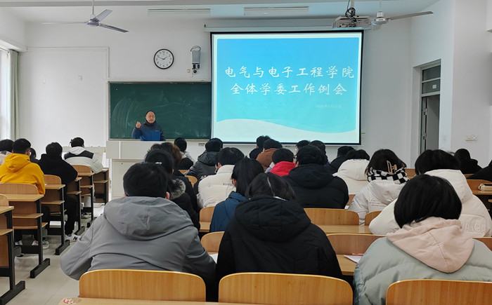新学期开始,为使学生能够快速进入学习状态,学委能够更好地投入到工作中,2月22日中午,电气与电子工程学院于致知楼A208教室召开学院新学期全体学委工作例会。学院党委副书记、纪委书记尚磊,辅导员陈更强,学习发展部全体成员,20级、21级、22级全体学委参加本次会议,会议由学生会学习发展部负责人李梓良主持。
