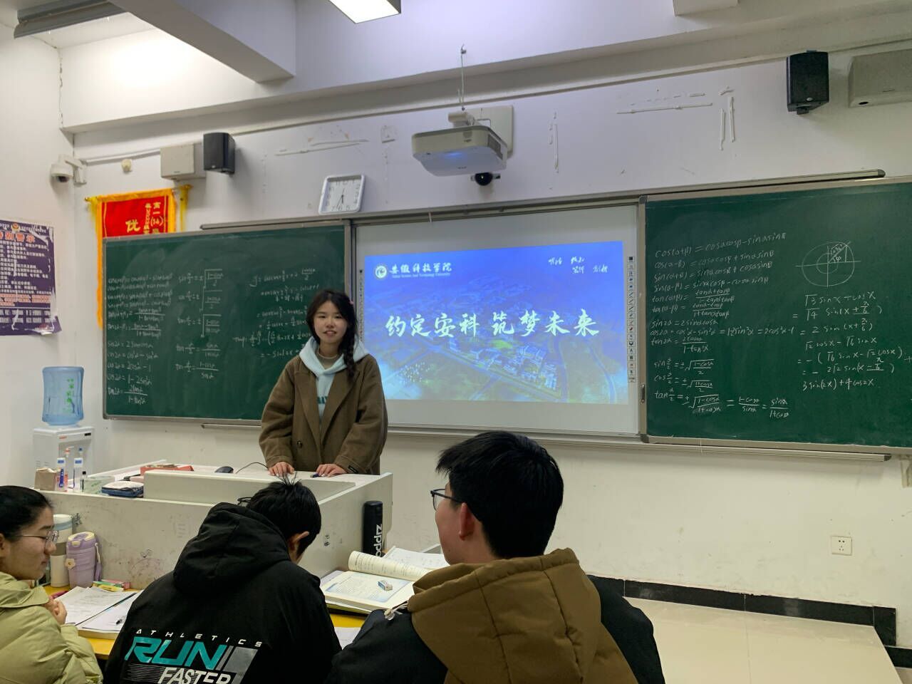 回到母校后,团队成员首先和高中班主任与老师汇报自己的成长业绩,与老师交谈在大学中的学习与收获,为老师送上感恩祝福。团队成员向学弟学妹们重点推介学科专业优势和特色,学校硕士学位授予单位和硕士点増列、安徽省三批次并行招生以及毕业生升学与就业情况,播放安徽科技学院的宣传材料,宣传材料围绕“历史底蕴有厚度,发展前景有高度,学科专业有广度,条件保障有力度,人才培养有温度,培养质量有高度“展开。旨在向学弟学妹们全面了解安徽科技学院,分享大学生活的乐趣,扩大安徽科技学院的知名度与影响力。最后,团队成员与学弟学妹们开展成长经验交流,分享学习过程中的经验与方法,与他们积极互动,解答他们对大学生活的疑惑,为学子们加油助威。