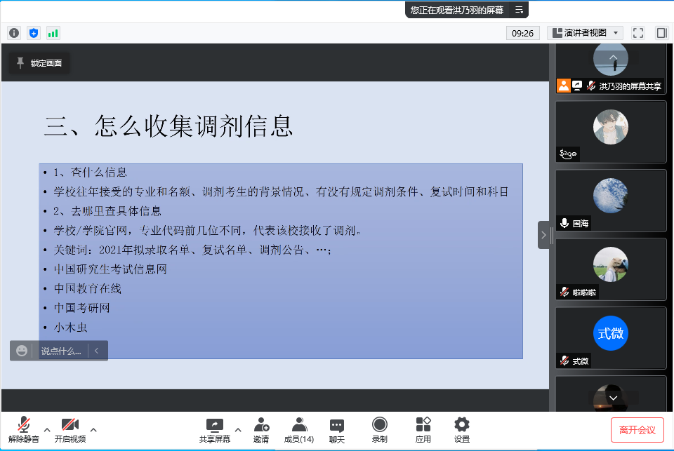 考虑到部分毕业生不在校,学院副院长国海组织开展线上线下同步视频会议,为有面试及调剂需求的学生分析当下研究生面试及调剂的注意事项。国海指出,考研升学是本科生毕业后优质选择之一,学历的提升对我们未来发展有重要的影响。参与考研的同学应做到,一是认真准备复试,做好专业课和英语双线准备;二是积极联系调剂,关注各高校官网发布的调剂信息。会后,国海对线上线下同学中国足彩网调剂院校、专业的选择等问题给出了进一步的指导。