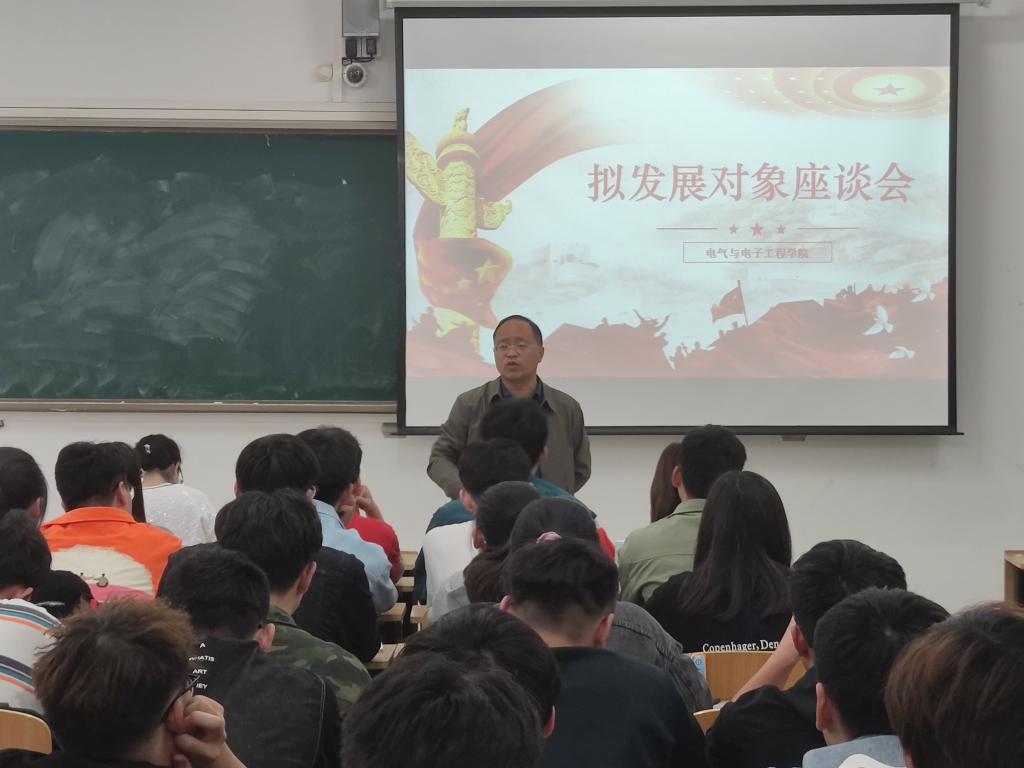 为进一步提高电气与电子工程学院党员发展质量,建设一支高素质的党员队伍,5月7日晚,电气与电子工程学院在致知楼A206教室召开拟发展对象座谈会。学院党委副书记尚磊、本次拟发展对象全体成员参加会议,会议由辅导员宋志华主持。