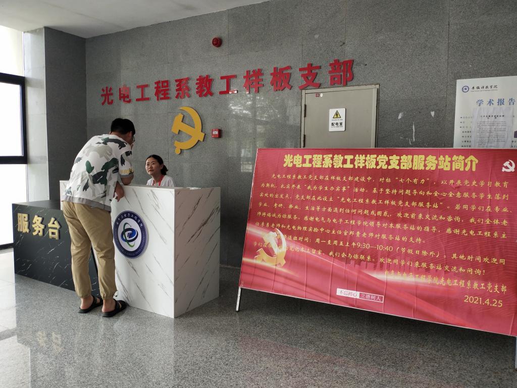 支部在有序推进党史学习教育中,将“我为学生办实事”落到实处,基于坚持问题导向和全心全意服务学生的出发点,在龙湖校区敏行楼B一楼大厅设立了“光电工程系教工样板支部服务站”,为师生之间提供了一个良好的交流平台。服务站每天支部党员教师按时值班,建立了联系学生机制。针对学生在专业、学业、择业、考研、生活等方面遇到的问题与困惑,党员教师竭诚为学生指导和服务,使学生坚定理想信念。自服务站设立以来,众多学生针对学业、考研和课程学习等方面的问题进行咨询,党员教师及时给出了具体可行的建议和意见,使学生受益匪浅。学生们普遍反映,教师解答问题热心、耐心、细心,学生普遍感到满意。下一步,服务站将建立长效机制,进一步扩展服务内容,与学院建立反馈机制,更好地服务于学生成长成才。