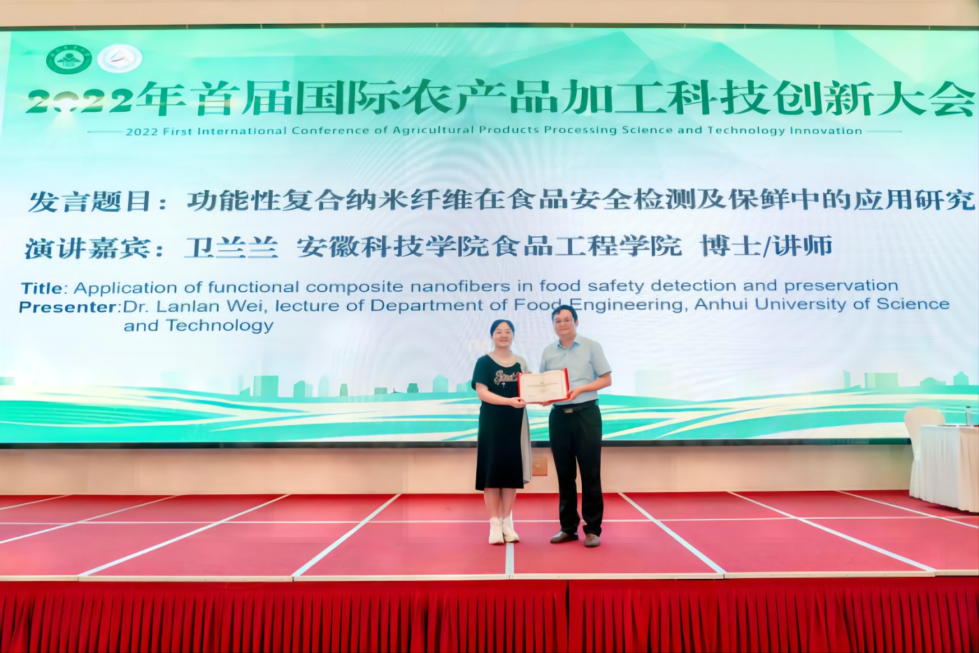 Recently, the "2022 First International Conference on Technological Innovation of Agricultural Products Processing" was held in Hefei, Associate Professor Chen Chunxu, Dr. Wei Lanlan and Dr. Yu Kun from Anhui Science and Technology University were invited to give three reports: “On the Effect and Mechanism of Sialylated IgG Regulating Intestinal Flora to Alleviate IBD”,” The Application of Functional Composite Nanofibers in Food Safety Detection” and “Preservation, and the Quality improvement and Digestive Characteristics of low GI Green Tea Sorghum Vermicelli”. In-depth exchanges were made on the research progress and trends of agricultural product storage and processing technology at home and abroad, the display of new achievements and the docking of the whole industrial chain, and the development of agricultural product processing industry was sought together. (Wei Zhaohui, School of Food Engineering)