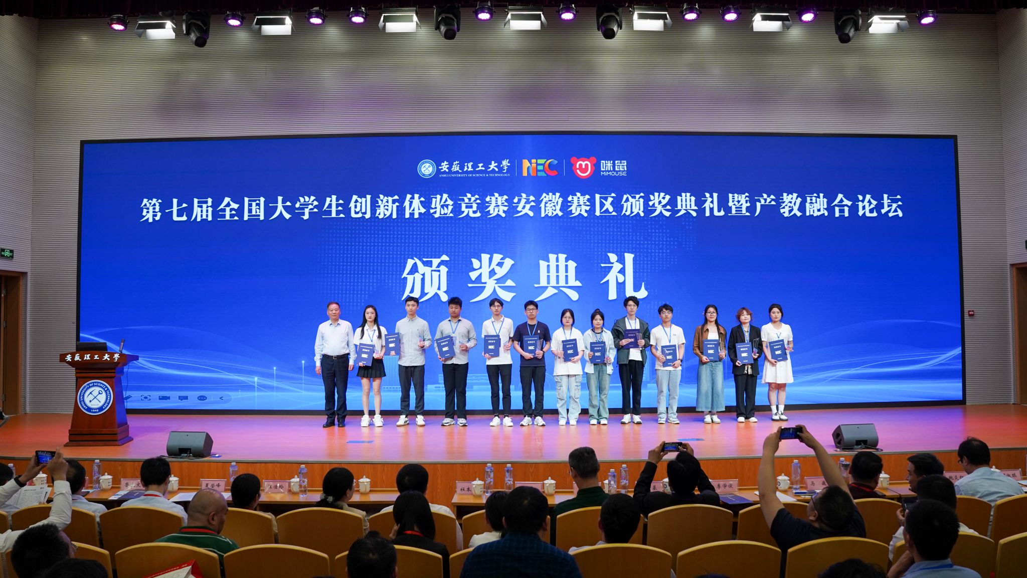 2024年5月10日,由中国创造学会主办,安徽理工大学和安徽咪鼠科技有限公司承办的第七届全国大学生创新体验竞赛安徽赛区颁奖典礼暨产教融合论坛在安徽理工大学隆重举行。本次活动得到了安徽省教育厅高教处副处长朱永国、安徽理工大学副校长宫能平、淮南市工商联主席杜本硕等多所高校和企业的领导和专家的大力支持与参与。