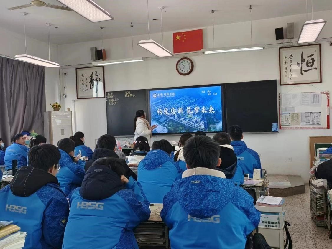 在活动中,姜玉雯和蒋园伟通过视频和PPT介绍了安徽科技学院的发展进程、学科优势、教学特色、校园文化,师资力量、先进的实验设备、完备的实验室制度、各项奖助学金政策以及职业生涯规划和就业指导服务等方面内容,分享了自身在高中最后的冲刺阶段对于优劣势学科的把控、学习心态调整以及如何充分利用考前的剩余时间等内容。