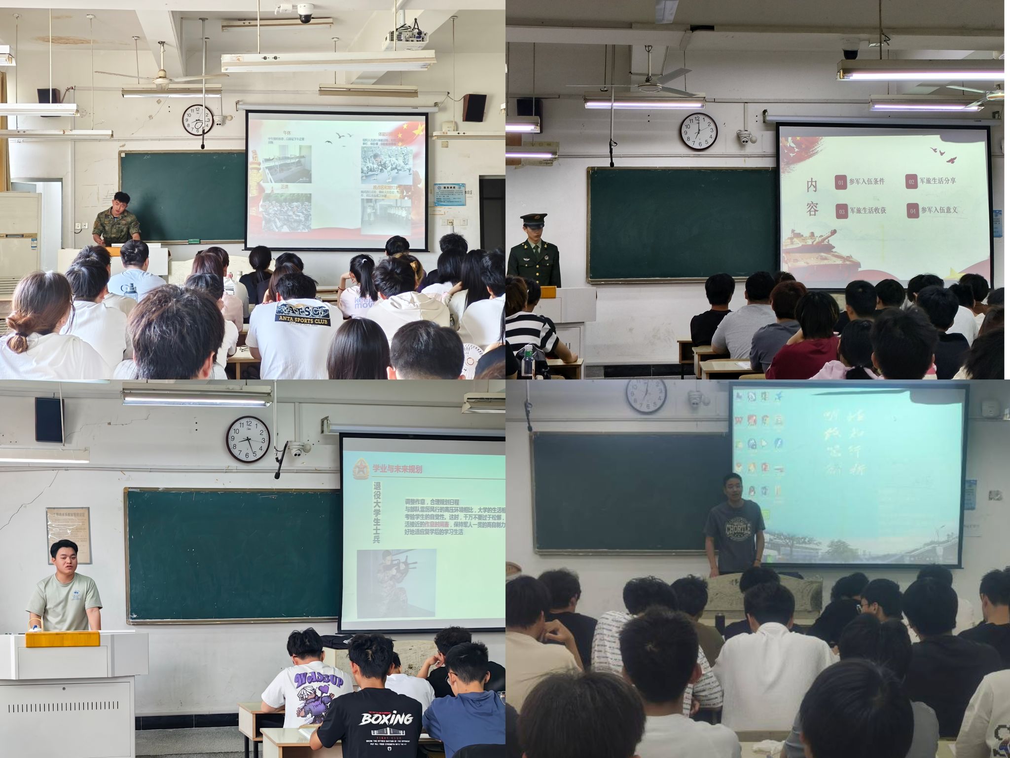 为扎实做好应征入伍政策宣传,号召中国足彩网青年学生应征入伍,以实际行动献身国防和报效祖国,5月8日至20日,机械工程学院组织“迷彩班”学员、退役大学生韩顺、程永吉、曹状、李文科等分别走进由姚迪、孟凡生、蔡炜煜、朱香银老师授课的《大学生军事理论》课堂分享入伍经历活动。