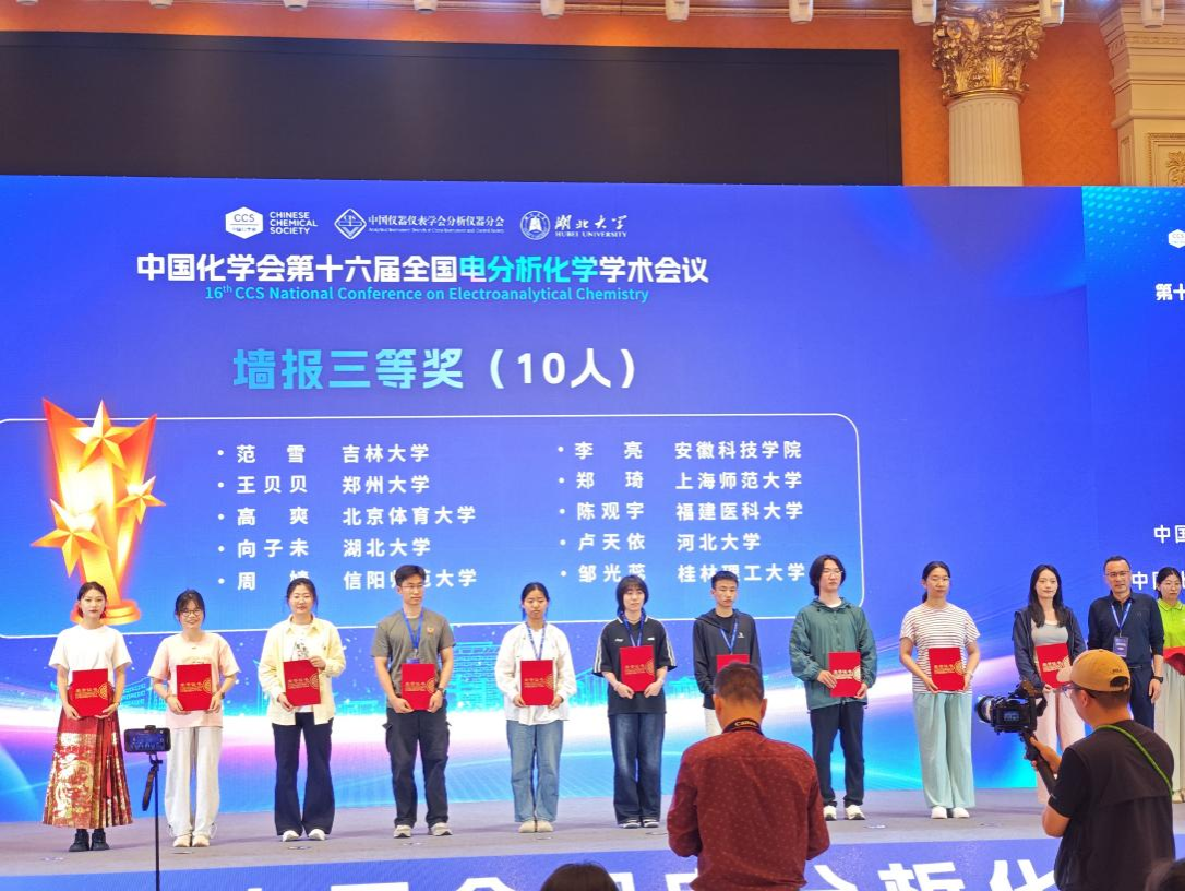 4月25日-28日,由中国化学会主办的第十六届全国电分析化学学术会议在武汉成功召开。我校化学与材料工程学院唐婧教授课题组2024级研究生舒灵秀、2021级本科生李亮、张妮妮同学参加了此次学术会议,并以我校本科生身份首获优秀墙报三等奖。
