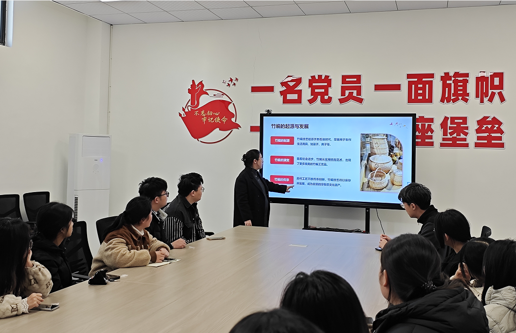 活动导入环节中,应用化学专业学生党支部书记薛璐莎介绍了竹编工艺的起源和发展,讲解了不同地域和行业中竹编工艺的不同用途,展示了部分竹编红色主题艺术作品,与学生党员一起感悟了竹编和竹编画中蕴含的中华民族传统文化的底蕴和革命文化的力量。