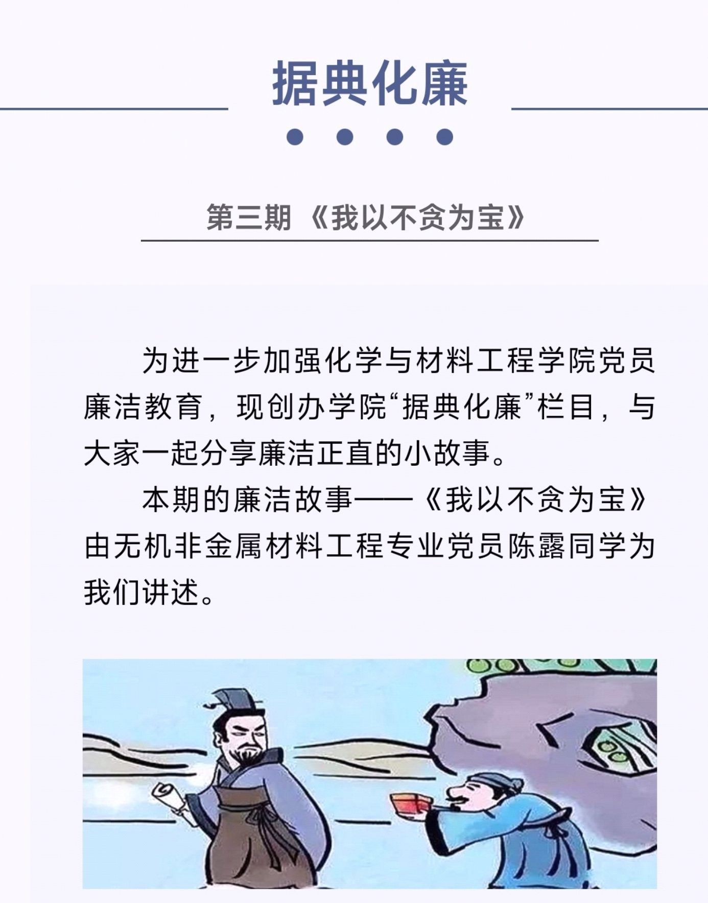 为进一步加强大学生廉洁教育,创新廉洁教育举措,化学与材料工程学院学生党支部结合易班推出“党建+易班”特色栏目《据典化廉》,面向全体大学生讲述廉洁教育小故事。栏目自推出以来,关注度较高,在大学生中产生了较大的影响力。