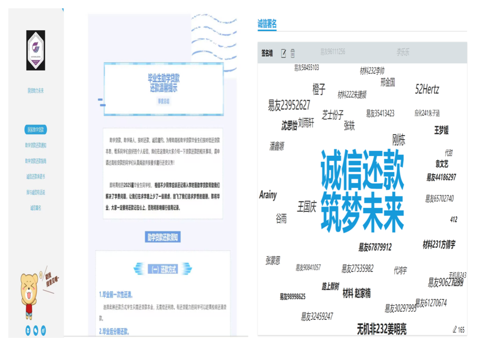 学院充分利用易班网络平台,开展形式多样的线上诚信教育活动。通过发布国家助学贷款免息政策推文、还款指南、诚信承诺书等内容,吸引百余名学生参与互动;线上“诚信签名墙” 收集承诺语160余条,营造了浓厚的诚信文化氛围。