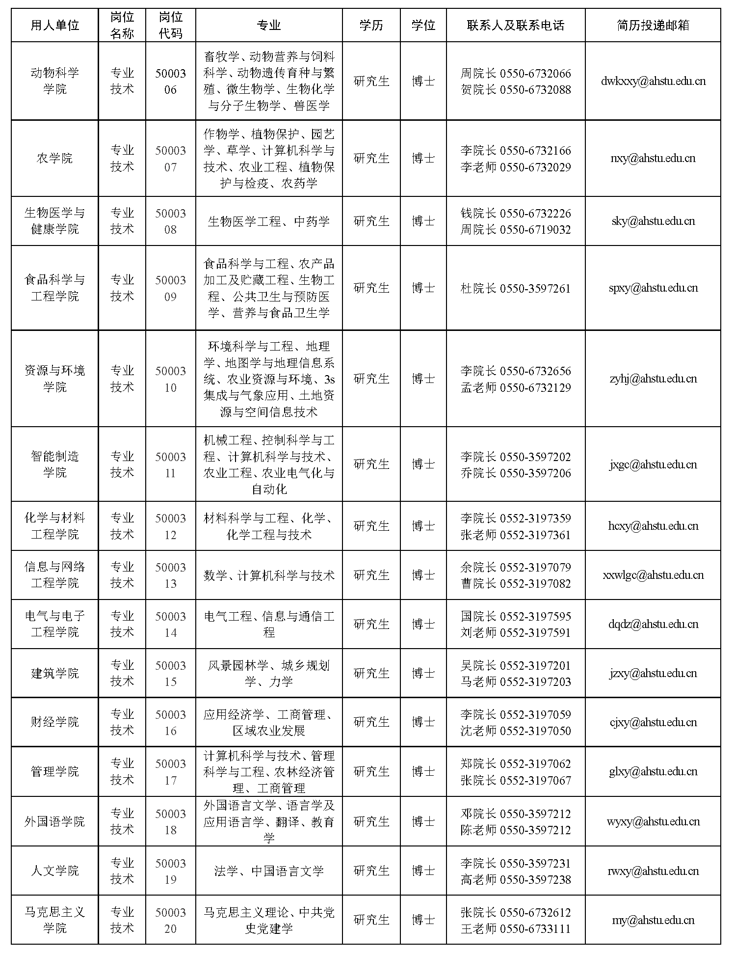 三、招聘条件 (一)基本条件 招聘对象除符合招聘岗位条件外,还必须符合以下基本条件: 1、具有中华人民共和国国籍; 2、遵守宪法和法律,热爱祖国,热爱教育事业; 3、遵守职业道德和学术规范,作风正派,品行端正; 4、善于团结协作,责任心强; 5、适应岗位要求的身心条件; 6、无违法违纪及不良记录。 (二)年龄要求 博士研究生40周岁以下(1985年1月1日(含)以后出生,以下类推),具有博士学位副高级职称人员45周岁以下,具有博士学位正高级职称人员50周岁以下,符合《安徽省高层次人才分级分类目录》认定A、B、C类条件的人员及特别优秀人员年龄可适当放宽。 (三)科研要求 各类人才科研业绩要求详见《安徽科技学院2025年人才引进办法》。 (四)教学要求 具备高校教师应有的基本素质和教育教学能力。有下列情形之一的人员,不得报考: (一)不符合岗位招聘条件的人员; (二)在读的全日制普通高校非应届毕业生; (三)现役军人; (四)在各级各类事业单位公开招聘中因违反《事业单位公开招聘违纪违规行为处理规定》被记入事业单位公开招聘应聘人员诚信档案库,且记录期限未满的人员; (五)曾因犯罪受过刑事处罚的人员和曾被开除公职的人员、受到党纪政纪处分期限未满或者正在接受纪律审查的人员、处于刑事处罚期间或者正在接受司法调查尚未作出结论的人员; (六)按照国家、省有关规定,尚在最低服务年限内的机关、事业单位正式在编工作人员; (七)法律法规规定不得参加报考或聘用为事业单位工作人员的其他情形人员。 报考者不得报考聘用后即构成《事业单位人事管理回避规定》第六条所列情形的岗位。 四、报名 请对照我校2025年招聘计划,向所在用人单位(简历投递邮箱见招聘计划)以附件形式投递应聘简历。 五、资格初审 收到应聘人员投递的报名材料后,相关用人单位对应聘人员材料进行资格审查,对符合岗位需求的人员,通知其来校参加考核。 六、考试考核 由用人单位负责,采用笔试、试讲、科研水平和实践技能相结合的方式进行。 七、成绩合成 按照笔试、试讲、科研水平相结合的方式进行考核的,成绩分别按2:4:4比例加权后确定总得分;按照笔试、试讲、科研水平、实践技能相结合的方式进行考核的,成绩分别按2:3:3:2比例加权后确定总得分。 八、体检和考察 体检工作按照人力资源和社会保障部、国家卫生计生委、国家公务员局《中国足彩网修订〈公务员录用体检通用标准(试行)〉及〈公务员录用体检操作手册(试行)〉有关内容的通知》(人社部发〔2016〕140号)和省委组织部、省人力资源和社会保障厅、省卫生厅《中国足彩网进一步规范全省事业单位公开招聘人员体检工作的通知》(皖人社秘〔2013〕208号)等有关规定执行。 考察工作根据拟聘用岗位要求,采取多种形式,全面了解掌握考察对象在政治思想、道德品质、能力素质、遵纪守法、廉洁自律、岗位匹配等方面的情况以及学习工作和报考期间的表现,核实考察对象是否符合规定的报考资格条件,提供的报考信息和相关材料是否真实、准确,是否具有报考回避的情形等方面的情况。 根据《中国足彩网加快推进失信被执行人信用监督、警示和惩戒机制建设的实施意见》(皖办发〔2017〕24号)等文件精神,考察结束时考察对象仍属于失信被执行人的,考察环节不予合格。 九、公示 对体检、考察均合格的拟聘用人员,学校研究通过后,在学校网站进行公示,公示期为5个工作日。 十、签约聘用 经公示无异议或公示结果不影响聘用的,由学校按照规定将有关材料报送省人力资源和社会保障厅办理有关聘用手续。对违反公开招聘规定或未能在2025年12月31日前提供招聘岗位所要求的相应层次的学历、学位等证书的报考人员,取消其聘用资格。 根据《事业单位人事管理条例》(国务院令第652号)规定,事业单位新进人员实行聘用制,须与招聘单位签订聘用合同,并按规定实行试用期,试用期包括在聘用合同期限内。试用期满合格的,予以正式聘用;不合格的,取消聘用。 十一、人才引进待遇 详见《安徽科技学院2025年人才引进办法》。 十二、其他事项 (一)招聘工作在安徽科技学院纪委的监督下进行,并接受社会及有关部门的监督。 (二)应聘者须严格对照招聘条件要求投递简历,对不符合学校招聘条件要求的人员一律不予聘用。资格审查贯穿于招聘工作全过程,如在招聘过程中任何环节发现应聘者有违纪违规、材料不齐、提供虚假信息或应聘者条件不符合招聘岗位条件要求等情况的,随时取消应聘资格或解聘。由此造成的后果,由应聘者本人负责。 本《公告》由安徽科技学院人事处负责解释。 咨询电话:0550-6732728 监督电话:0550-6732800 联系人:史老师 谢老师 E-mail: rsc@ahstu.edu.cn 特此公告。 安徽科技学院 2025年4月9日 | |