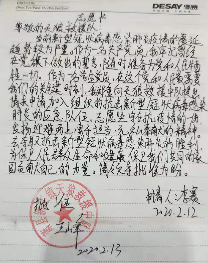 “作为一名共产党员,我牢记曾经在党旗下做出的誓言……志愿坚守在抗疫一线……去夺取抗击新型冠状病毒感染肺炎的胜利”。这是食品工程学院2018级粮食工程专业的学生党员李赛向当地阻击新冠肺炎疫情的天狼救援队写下的志愿书,也是一名学生党员面对祖国困难时的请战书。这是他第二次向该组织投递志愿书。李赛说:“面对疫情,作为一名学生党员,应该发挥先锋模范作用,率先投入到疫情阻击战当中,用自己的行动诠释党旗下的初心”。在工作岗位上,他主要负责对来往人员车辆的检查登记以及体温测量工作,检查出行人员相关部门出具的通行证明。李赛说到:“在这里的工作中,我们是身后千百户村民安全的第一道防线,也是最重要的一道防线,我相信,在大家共同的努力下,一定能完胜这场疫情阻击战。”