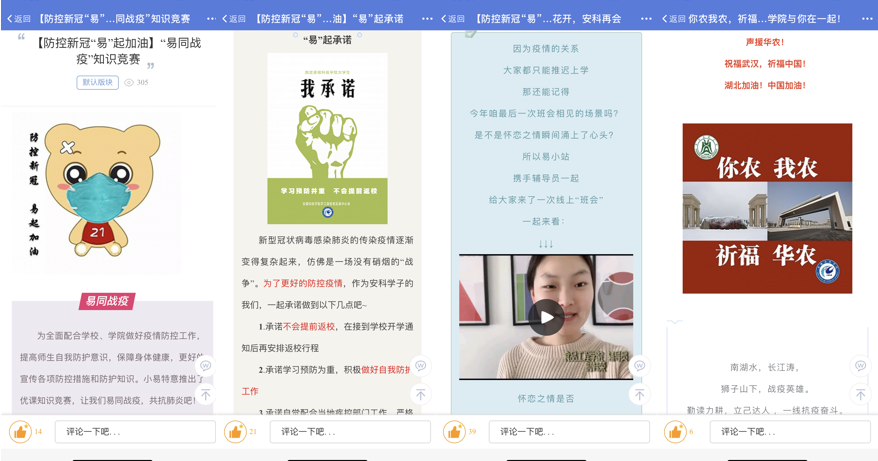 构建全方位的宣传体系,开设“防控新冠易起加油”版块,自1月25日起不间断推送各类疫情防控专题帖50余篇,介绍全国疫情防控形势,个人疫情防控知识,以及学校疫情防控工作部署安排,积极宣传抗疫一线的感人事迹。发起线上“我是安科学子—“易”起承诺”活动,承诺疫情期间科学防控,不传谣不信谣,学习预防并重,绝不提前返校。推送《安徽科技学院致全体师生员工一封信》《同舟共济战疫情——致湖北籍大学生的一封信》,有效凝聚起众志成城、共克时艰的强大正能量。