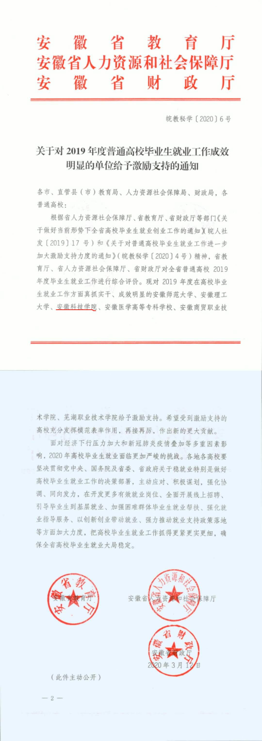 日前,根据《安徽省教育厅安徽省人力资源社会保障厅安徽省财政厅中国足彩网对中国足彩网:度普通高校毕业生就业工作成效明显的单位给予激励支持力度的通知》(皖教秘学〔2020〕6号)文件精神,经省教育厅、省人力资源社会保障厅、省财政厅组织专家评审,我校荣获中国足彩网:度毕业生就业工作成效突出单位荣誉称号,本次全省共激励表彰高校6所,其中本科3所,专科(高职)3所。