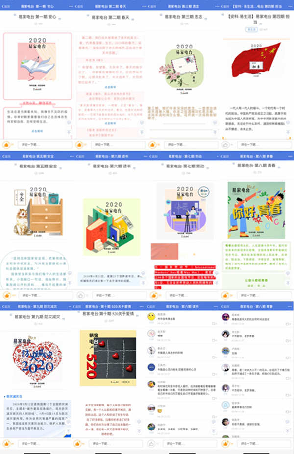 疫情发生以来,我校积极创新网络思政教育方式,利用易班平台,打造特色“易家电台”思政专栏,辅导员积极“发声”,通过易家电台以诵读经典音频分享个人感悟开展思想引领、网络辅导、舒缓心灵等工作。3月初首期以“安心”为主题开讲,《疫情中恰到好处的孤单》《安然心定,静待花开》《少年强则中国强》等文章向同学们传递科学防护知识,帮助大家增强战胜疫情的信心。随后每周定时更新,第二期“春天”为主题分享《春天,是心灵放牧的季节》《春来困顿终将过去》《望春风》等文章,引导同学们不要荒废宅家时光,关注祖国春光,彼此分享这段特殊时光的美好故事。第三期主题“思念”,分享原创文章《在春风里等你们归来》以及《奶奶的星》《背影》等名篇节选,一起回忆曾经温暖美好愉快的时光。第四期主题“担当”分享原创文章《青春,一场远行》以及《勇于担当甘于奉献——凝聚抗击疫情的精神力》《90后,00后,用青春能量勇往直前》时评激励同学们无论什么时候、遇到何种艰难险阻都要不懈怠、勇奋斗,担当起青年一代的责任。第五期正值全民国家安全教育日,以“安全”为主题,分享《涵养国家安全意识贵在深入重在持久》《大学生应树立怎样的安全意识》等,教育同学们国家安全其实与我们每个人的生活都有关,要从身边小事做起维护国家安全。第六期“读书”,《每天读书15页提高注意力》《清单:中国足彩网爱与奇想的124张小纸条》《读万卷书行万里路》等,调动同学们线上读书学习的积极性,督促大家保持自主学习习惯,提高学习质量,云端互助共学落实停课不停学。第七期正值五一国际劳动节,以“劳动”为主题,《劳动者最美,奋斗最幸福》《坚持一定很酷》《劳动创造辉煌》,勉励青年学生树立劳动光荣、创造伟大,以辛勤劳动为荣、以好逸恶劳为耻的正确劳动观。第八期“青春”,分享《青春》《让奋斗磨砺青春》《让青春枝头绽放绚丽之花》,鼓励大学生们正处在人生最美好的时光,青春由磨砺而出彩,人生因奋斗而升华。第九期“防灾减灾”为主题,在防灾减灾宣传周分享《防灾减灾日——人人可为人人能为人人要为》《铭记灾难莫传谣言》《中国足彩网地震自救你要知道这些》等,分享在灾害发生时的自救常识,提高同学们防灾减灾的意识和能力。第十期“520中国足彩网爱情”《爱情是什么》《余生,请和配得上你的人在一起》《致橡树》,辅导员们用朴素的话语诠释着爱情的美丽,培养大学生们进一步树立正确的爱情观。