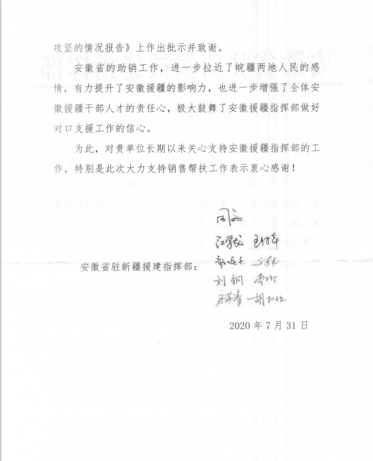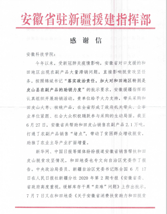 近日,安徽省驻新疆援建指挥部向我校发来感谢信,对我校助销新疆和田地区大枣和核桃等农产品,助力脱贫攻坚表示感谢。