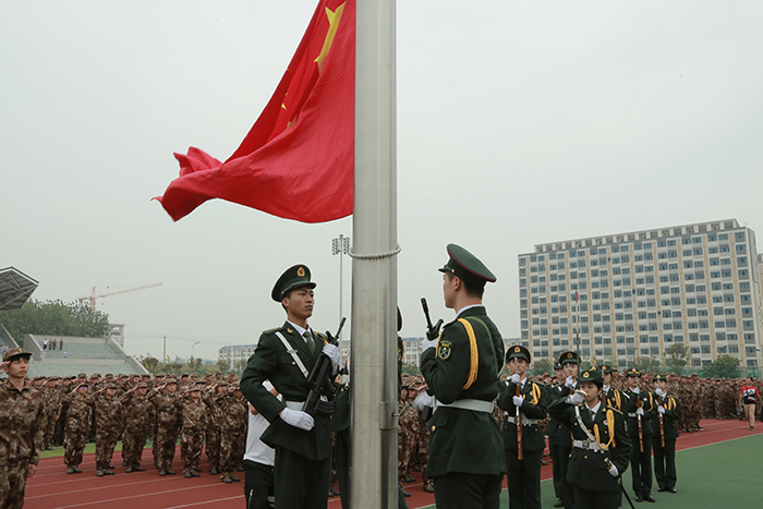 大会在庄严的升国旗仪式中拉开帷幕。分列式方阵自信昂扬地行进到主席台接受检阅。他(她)们整齐的队列、铿锵的口号、威武的军姿、昂扬的斗志、严明的纪律,充分展现两周来的军训成果。