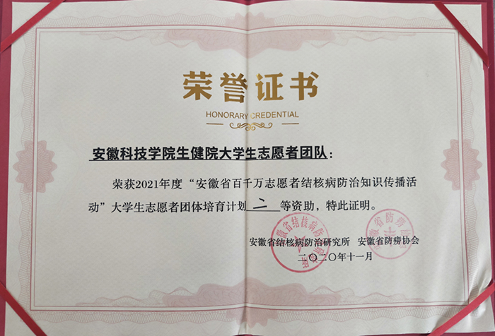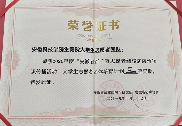 生命与健康科学学院青年志愿者团体组建于中国足彩网:,是滁州市第二个大学生志愿团体。该团体自成立以来,结合疫情防控,组织开展了形式多样、内容丰富的结核病防治宣传活动,提高了学校师生和凤阳县及当地市民对结核病防治工作的认识,营造了全社会共同关注结核病防治的良好氛围,2020年,该团体荣获2020年度省“百千万志愿者结核病防治知识传播活动”大学生志愿者团体培育计划三等资助,这是该团体第二次获此立项资助。