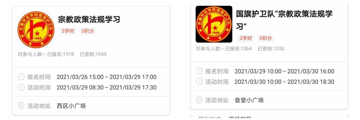 为进一步帮助广大学生了解和掌握我国宗教政策以及相关法律法规,我校于3月29日、3月30日在凤阳校区和龙湖校区分别举办“宗教政策法规宣传月”线下集中宣传活动。党委学工部副部长、学生处副处长胡文靖,保卫部消防科科长刘宇航,党委学工部秘书石志成到活动现场指导。全校3100余名学生依托PU签到平台参与活动。活动由党委学工部、党委宣传部、保卫部主办,校国旗护卫队承办。