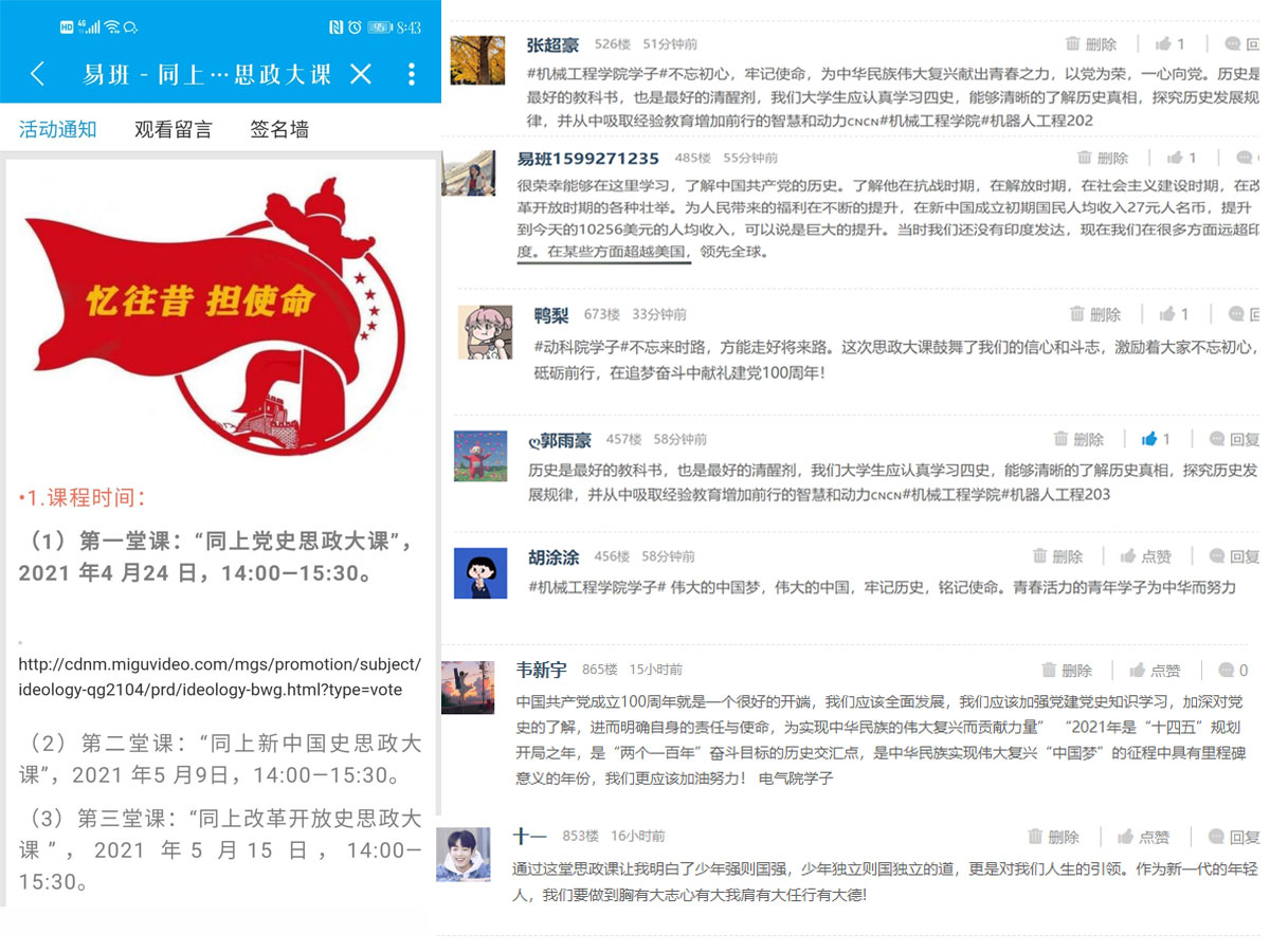 为使学生真正地学有所思、学有所获,本次活动前,学校通过官网、安科学工微信公众号、安科易班多平台广泛宣传动员,并通过易班轻应用搭建学习讨论板块。观看期间,收到全校师生近千条留言。在讨论交流中,同学们反响强烈,踊跃发言,纷纷表示,“四史’思政大课”内容丰富、案例详实、讲授生动,自己深受鼓舞和启发,非常有获得感,表示一定要努力奋斗,不负韶华,使自己成为一个立大志、明大德、成大才、担大任的新时代社会主义接班人。(特约通讯员:石志成 审核:胡文靖 编辑:张威 )