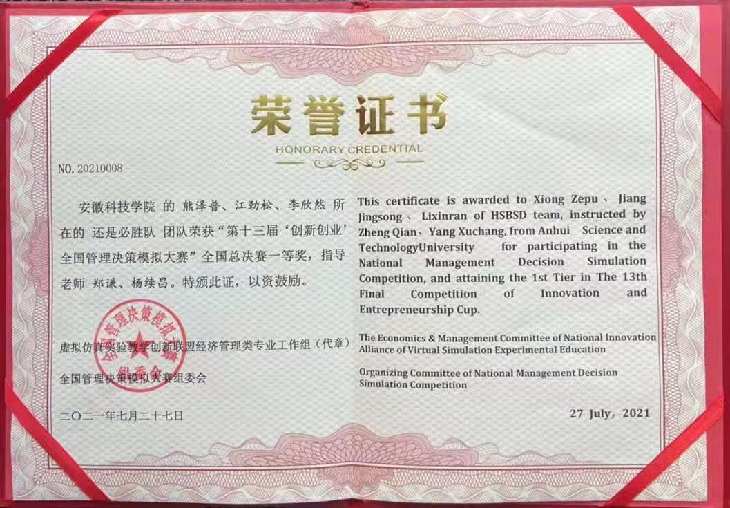 我校学子再次斩获全国管理决策模拟大赛一等奖