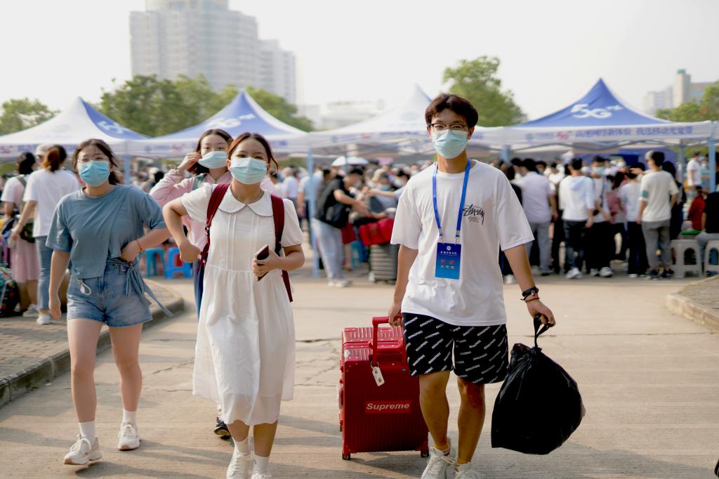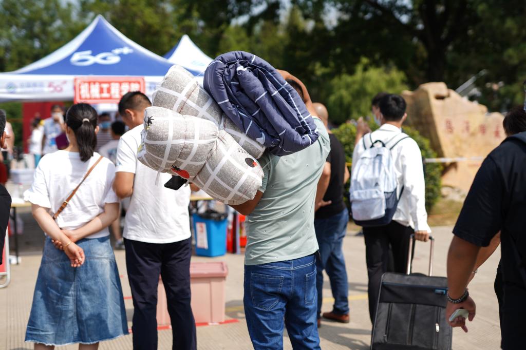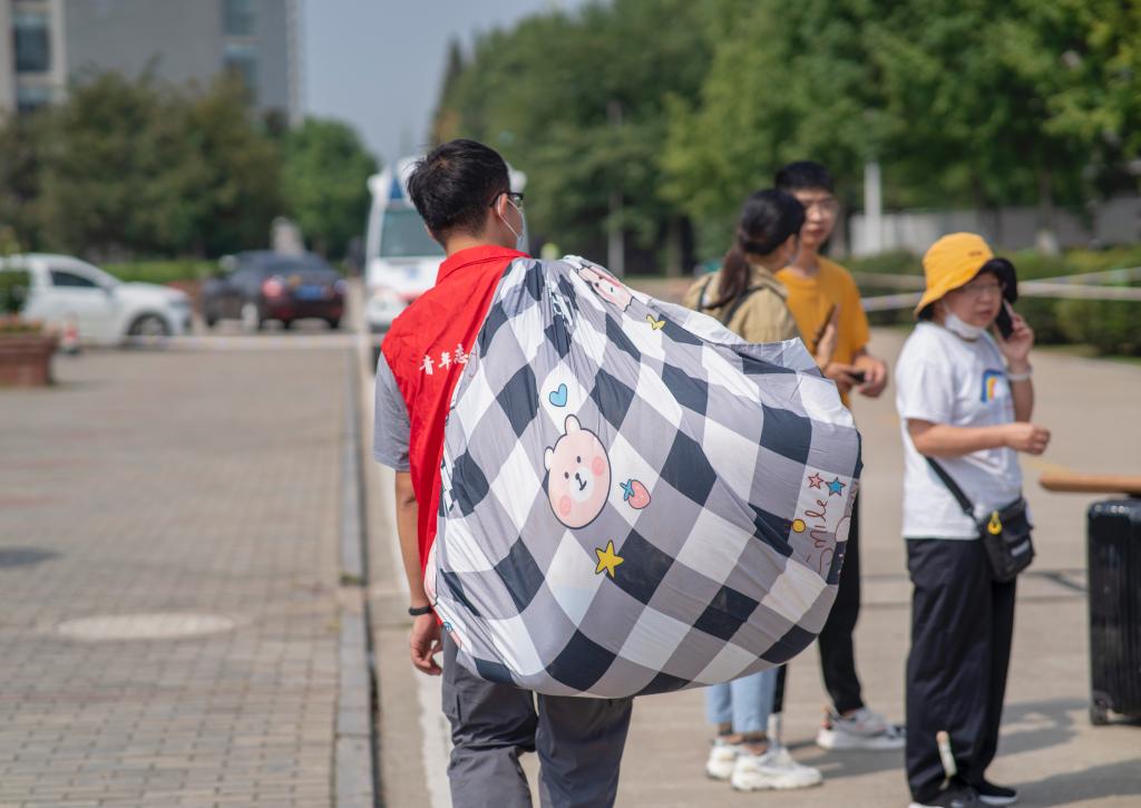 接过家长手中的行囊,我们就是一家人。志愿者们用热情与行动换得家长们的安心。