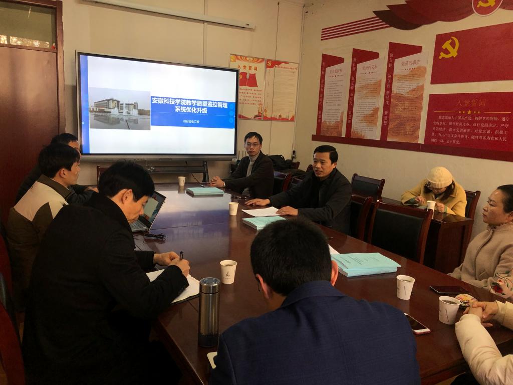 2021年12月2日下午,督导考核办公室在教务处会议室组织开展安徽科技学院教学质量监控管理系统优化升级项目验收工作。参加验收会议的有校教务处、财务处、网络与信息技术中心、国有资产管理处、督导考核办公室和项目实施方的相关技术人员。验收会由督导考核办公室主任程斌主持。