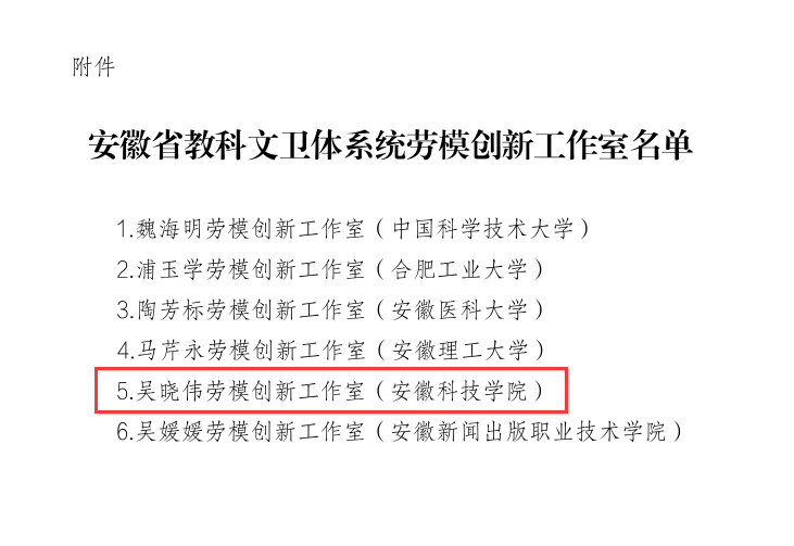 12月27日,安徽省教科文卫体工会下发《中国足彩网命名安徽省教科文卫体系统劳模创新工作室的决定》文件,我校食品工程学院吴晓伟副教授领衔申报的“劳模创新工作室”荣获命名。