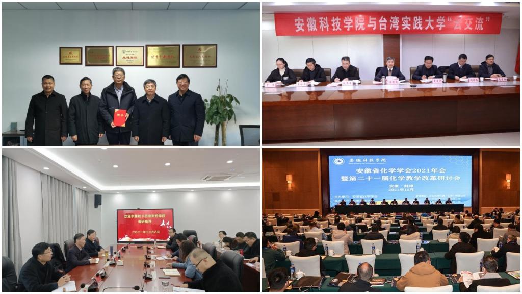 【综述】12月3日至5日,安徽省化学学会2021年会暨第二十一届化学教学改革研讨会在蚌埠顺利召开。会议由安徽省化学学会主办,我校承办,中国科学技术大学、合肥工业大学、安徽大学等28所高校、15家企业及部分中学的200余名代表参加本次大会;12月8日,校党委副书记、校长李震,党委委员、副校长李升和调研指导财经学院会计专业硕士学位点申报工作。财经学院党政领导班子成员,财管系、会计系全体教师以及学院所有副高以上教师参加会议;12月17日,我校与台湾实践大学举行“云交流”活动,党委书记蒋德勤,党委委员、副校长黄友锐,台湾实践大学校长丁斌首、副校长江岷钦,特邀嘉宾敏惠医专校长叶至诚出席会议。会议由校港澳台事务办公室主任刘东楼、实践大学秘书室组长黄雅轩共同主持;12月29日,我校在中国农业科学院作物所栽培中心会议室举行聘任李少昆二级研究员为特聘教授仪式。校党委书记蒋德勤主持聘任仪式并讲话,党委副书记、校长李震,党委委员、副校长李升和出席聘任仪式。