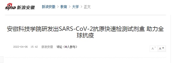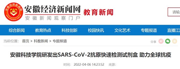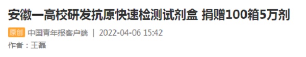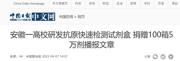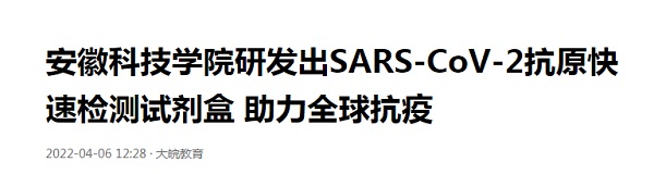 我校党委和行政高度重视新冠肺炎疫情防控,充分发挥学校应用型研究的传统优势,及时组建并全力支持生命与健康科学学院刘国东教授新冠肺炎检测研发科研团队加强技术研发攻关。日前,校园网一则有关“100箱5万剂由我校生命与健康科学学院科研团队联合英飞凌生物科技(江苏)有限公司研发生产的SARS-CoV-2抗原快速检测试剂,通过物流快递从我校凤阳校区发往驻肥多所大中专学校,助力全省疫情防控”的报道,受到了人民网、中青网、中国网、中国教育在线、安徽教育网、今日头条、凤凰网、新浪网、安青网等众多媒体关注。本网作整理汇编并滚动推出,以飨读者。