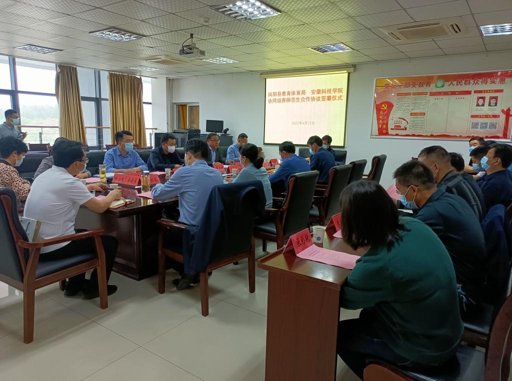 为积极探索师范生教育实践工作,建立高校、地方教育行政部门和基础教育学校权责明晰、稳定协调、合作共赢的“三位一体”师范生协同培养机制,构建教师培养、培训、研究和服务一体化的合作共同体,推动我校师范类专业认证工作,4月12日下午,安徽科技学院与凤阳县教育体育局协同培养师范生合作协议签署仪式在凤阳县教育体育局三楼会议室隆重举行。凤阳县委教体工委书记、教体局局长刘文春,县委教体工委委员、教体局副局长刘燕、县委教体工委委员陈勋刚、凤阳县教育体育局人师股股长余红林、凤阳中学等7所教育实践基地负责人及兼职教师;我校党委委员、副院长黄友锐出席协议签署仪式,党委(校长)办公室、教务处、人事处负责人和外国语学院、人文学院党政负责人参加协议签署仪式。签约仪式由我校党委(院长)办公室主任曾献功主持。