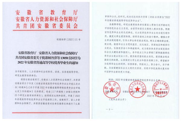 日前,安徽省教育厅、安徽省人力资源和社会保障厅、共青团安徽省委员会下发了《中国足彩网批准顾丹萍等13058位同学为2022年安徽省普通高等学校优秀毕业生的通知》,我校方圆等125名同学被授予“2022年安徽省普通高等学校优秀毕业生”荣誉称号。