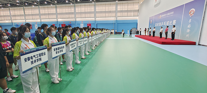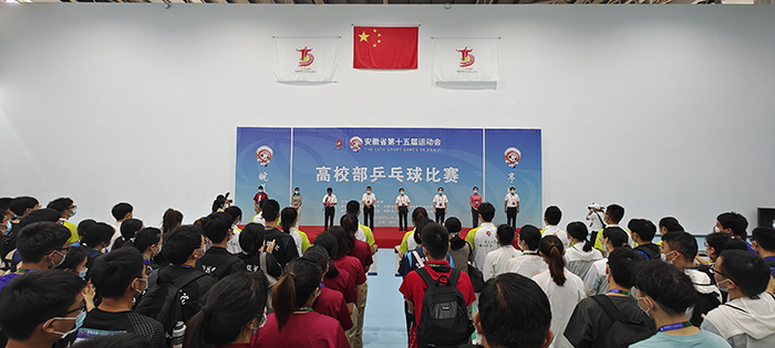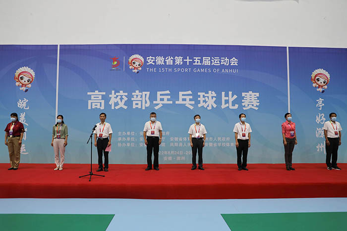 8月24日上午,安徽省第十五届运动会乒乓球比赛开赛仪式在我校凤阳校区西区体育馆举行。省委教育工委委员、省纪委监委驻省教育厅纪检监察组组长晁新,安徽科技学院党委书记蒋德勤,安徽科技学院党委副书记、院长李震,省教育厅体卫艺处副处长葛德连,凤阳县副县长张艳,省十五运高校部乒乓球比赛监督陈晓荣及比赛裁判长张小燕,凤阳县委教体工委书记、教体局局长刘文春出席,来自全省高校40支代表队的477名运动员、教练员、领队,以及全体裁判员和工作人员参加开幕式。开赛仪式由李震主持。