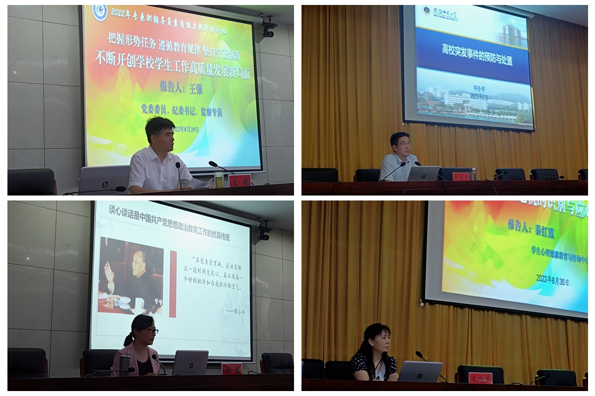 本次培训班持续3天时间,采取线下集中培训、分学院自主研讨和自学相结合的形式进行。各二级学院党委书记出席开班式,各二级学院党委副书记、全体专职辅导员和2022级新生兼职辅导员参加培训班。安徽师范大学党委学工部部长、学生处处长邵登辉,安徽医科大学黄锟副教授,学生心理健康教育与咨询中心主任秦红霞副教授,校后勤保障部副主任谷凯分别就高校突发事件的预防与处置、高校辅导员谈心谈话技巧、大学生心理危机识别与干预、校园疫情防控等做专题辅导报告和讲座。化学与材料工程学院、农学院、建筑学院和资源与环境学院在结业式上作了交流发言。