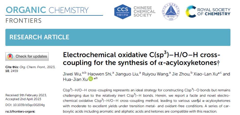 我校化学与材料工程学院吴际伟老师(第一作者)在国际知名学术期刊《Organic Chemistry Frontiers》(中国科学院分区:化学/有机化学1区Top期刊)上发表题为“Electrochemical oxidative C(sp3)–H/O–H crosscoupling for the synthesis of α-acyloxyketones”(DOI: 10.1039/d3qo00204g)的研究论文于4月3日见刊,我校为第一单位。