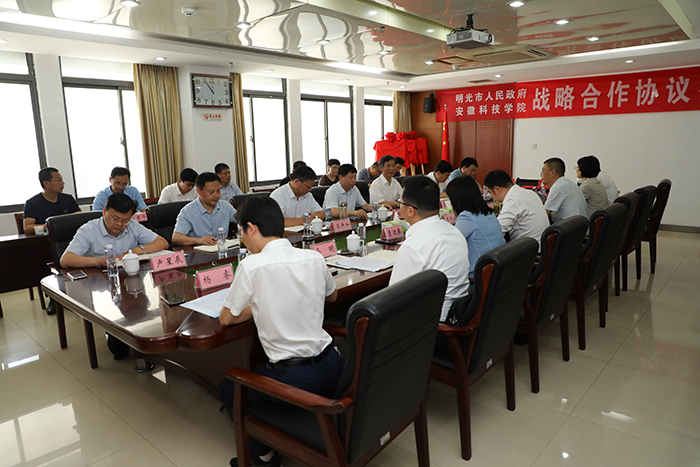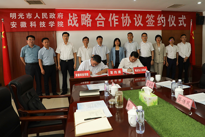 6月9日,我校与明光市政府签署校地全面深化战略合作协议,共启互利共赢新篇章。明光市委副书记、市长张传宗,市人大常委会主任曹迎春,市政协主席张言平,市委常委、组织部部长马明,副市长缪传凤、杨睿,明光经开区管委会主任贾宝兵;我校党委书记时伟,党委副书记、院长李震,党委委员、副院长李升和出席签约仪式。签约仪式由李震主持。