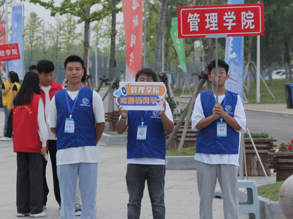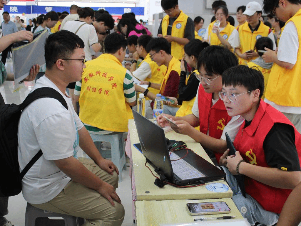 身穿志愿者马甲的学长学姐们在人群中来回穿梭,迎接每一位到来的新生,帮助新生们搬运行李,驱散他们初来乍到的陌生和无措。在学长学姐的悉心引导和暖心帮助下,新同学们热闹而有序的领取校园卡、确认入学信息、领取资料、办理各项手续。