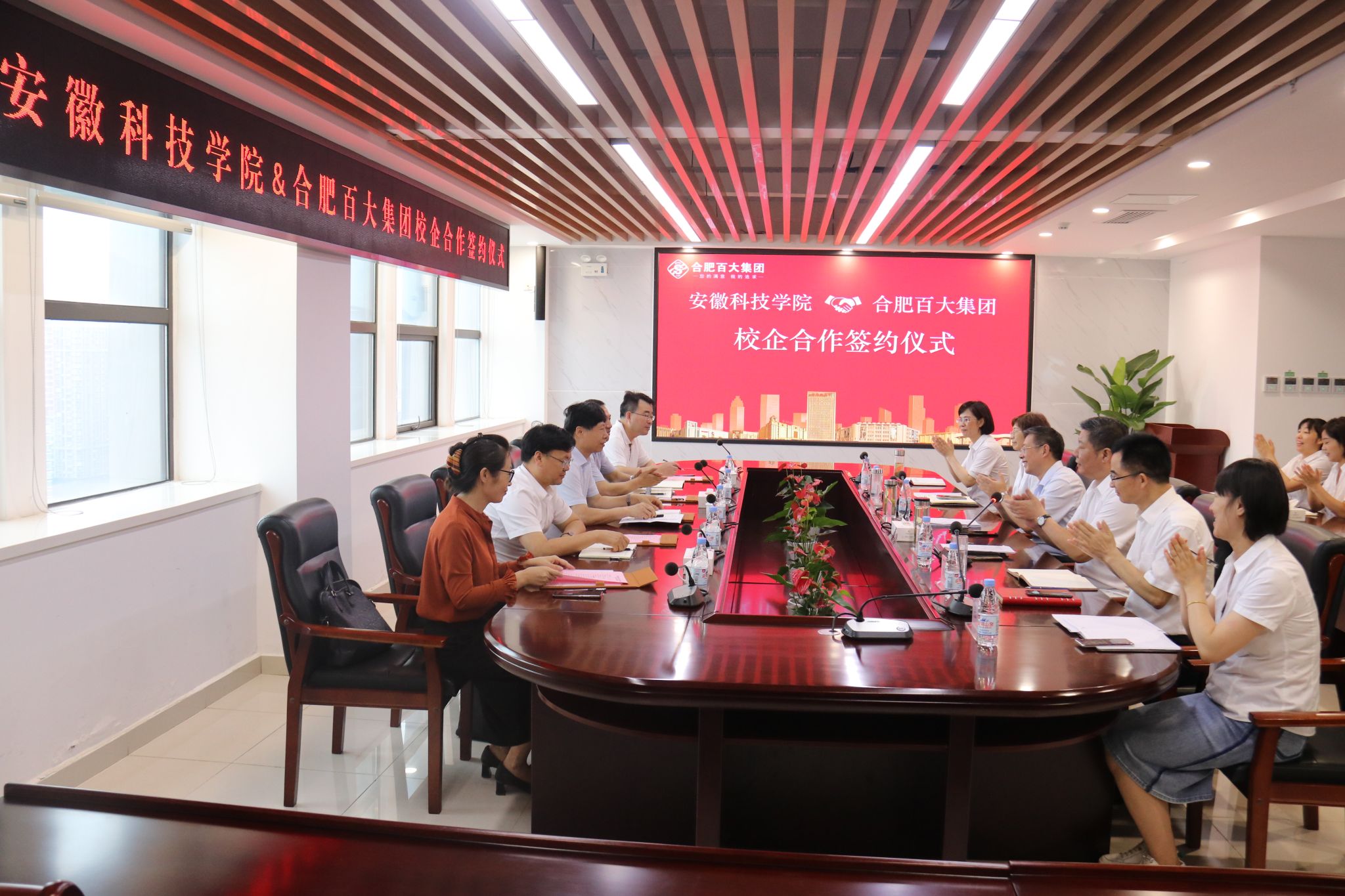 财经学院院长郝世绵和百大集团党委委员、工会主席裴文娟代表双方签署了《合肥百大集团 安徽科技学院战略合作协议》;双方观看了合肥百大集团宣传片,并围绕智力共用、人才共育、项目共研、平台共享等进行深入交流。