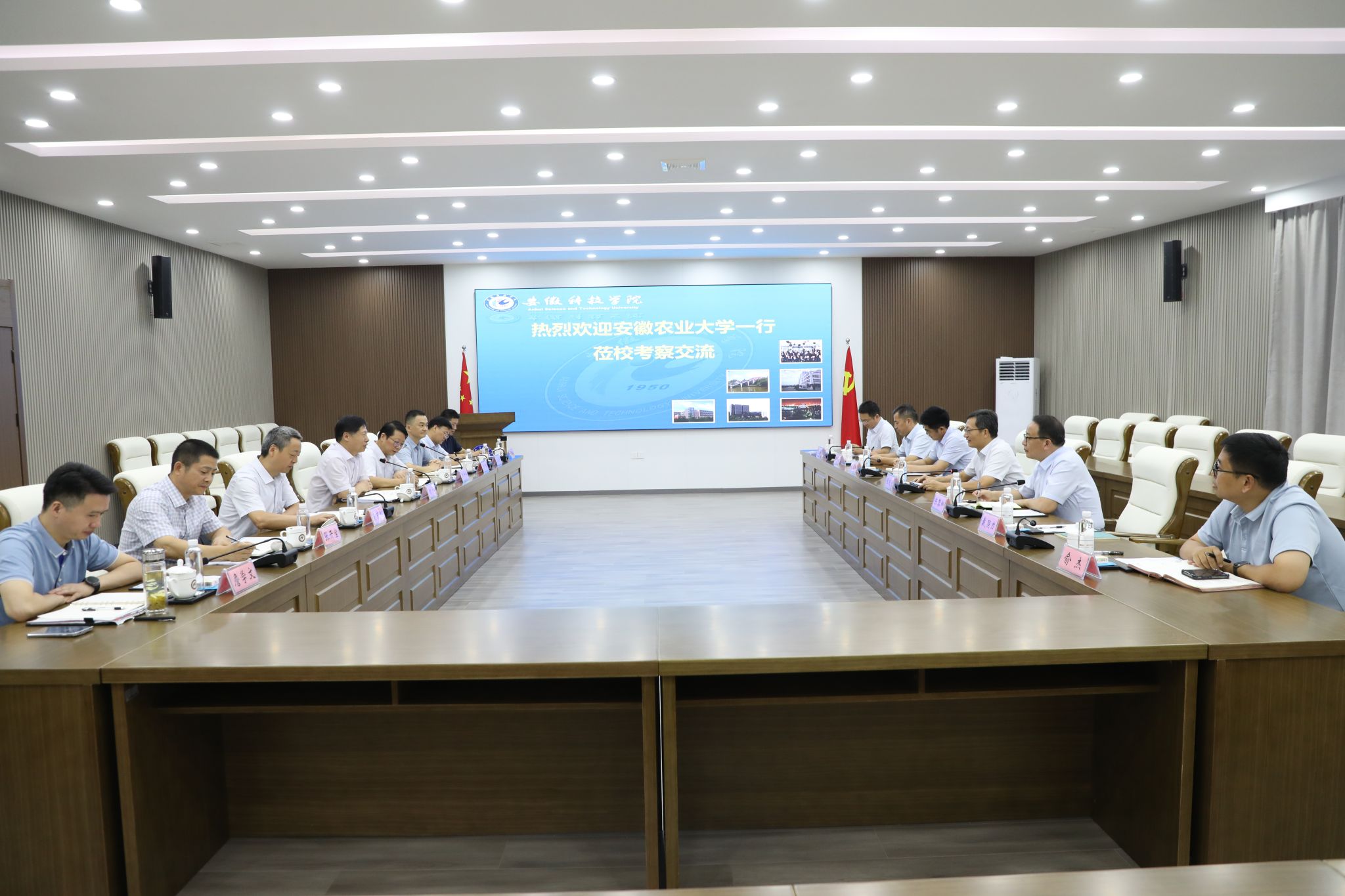 8月27日上午,安徽农业大学党委书记张庆亮率党委常委、副校长陈黎卿,党委常委、纪委书记、监察专员程道传及党政办公室、纪委办公室、人事处、社会合作处等部门负责人莅临我校考察交流。我校党委书记时伟,党委副书记、院长李升和,党委委员、纪委书记、监察专员彭庆刚,党委委员、副院长方鸣及对口部门负责人热情接待了张庆亮一行。