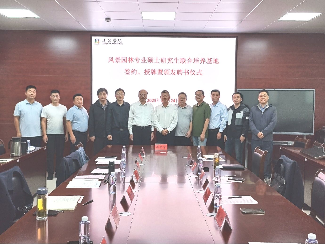 9月24日下午,校党委委员、副院长王孝义出席安徽科技学院与蚌埠市园林管理处等四家单位共建风景园林专业硕士研究生联合培养基地签约颁证仪式。蚌埠市园林管理处主任杨东、蚌埠市建筑设计院集团有限公司总经理凌建祥、蚌埠市规划设计研究院总工杨洪钧、安徽建工水利开发投资集团生态科技有限责任公司副经理李坤、研究生处处长、学科办主任张春雨、建筑学院副院长吴伟东、党委副书记谢宜勤等有关人员出席仪式。仪式由建筑学院副院长张伟主持。