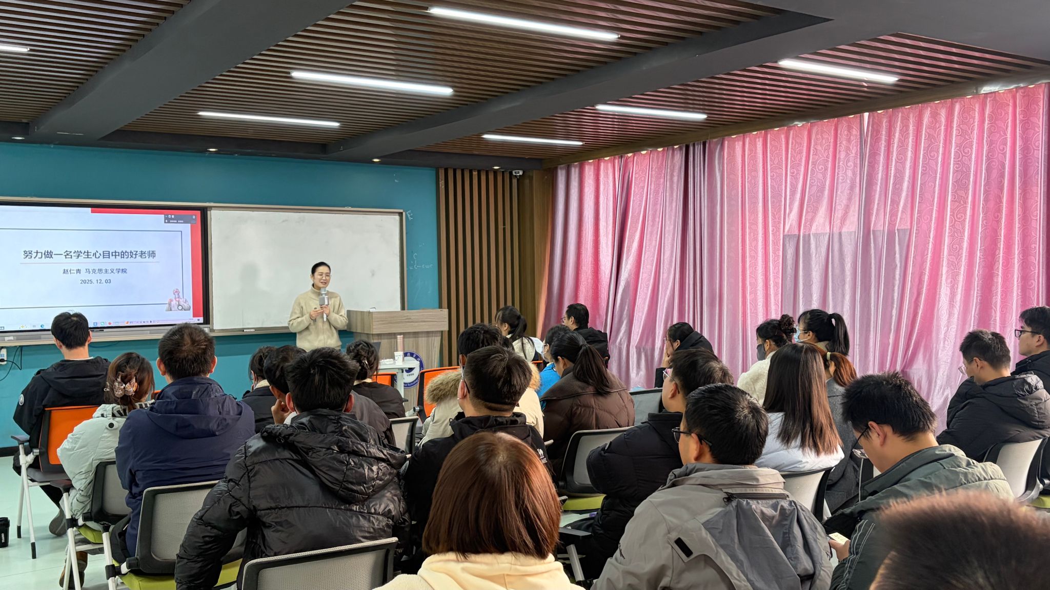 赵仁青教授紧扣“四有好老师”主题,结合生动案例与自身从教经历,深入阐述了教师践行高尚师德对落实立德树人根本任务的重要意义。她指出,教师应以理想信念为核心,做坚定信仰传播者;以道德情操为纲领,做人格魅力感染者;以扎实学识为根基,做传道授业解惑者;以仁爱之心为灵魂,做心灵之花浇灌者。整场报告如春风化雨般浸润人心,既展现了理论的高度,又蕴含着实践的智慧,为我校新进教师的专业成长与教师队伍的持续优化提供了重要的思想启发与清晰的实践路径。