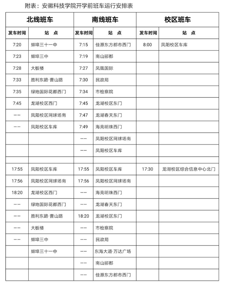 2、8月20-30日(含周六、周日),南、北线班车和校区班车运行,具体站点和时间见《安徽科技学院开学前班车运行安排表》。