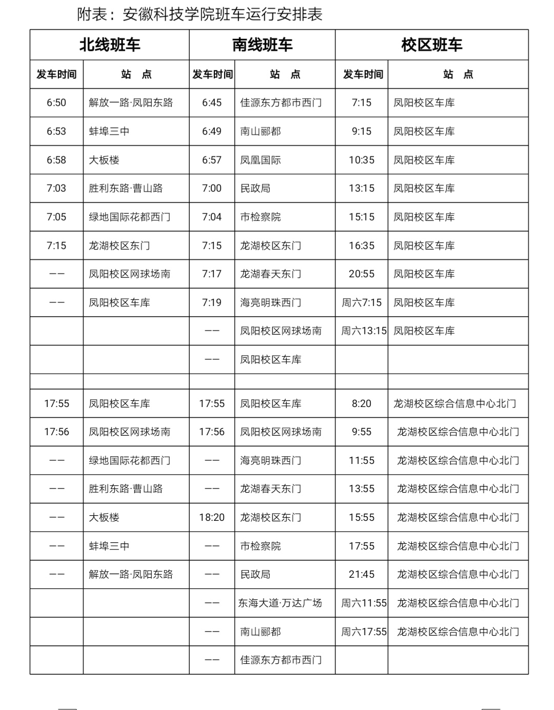 1.班车运行班次和站点见《安徽科技学院班车运行安排表》。