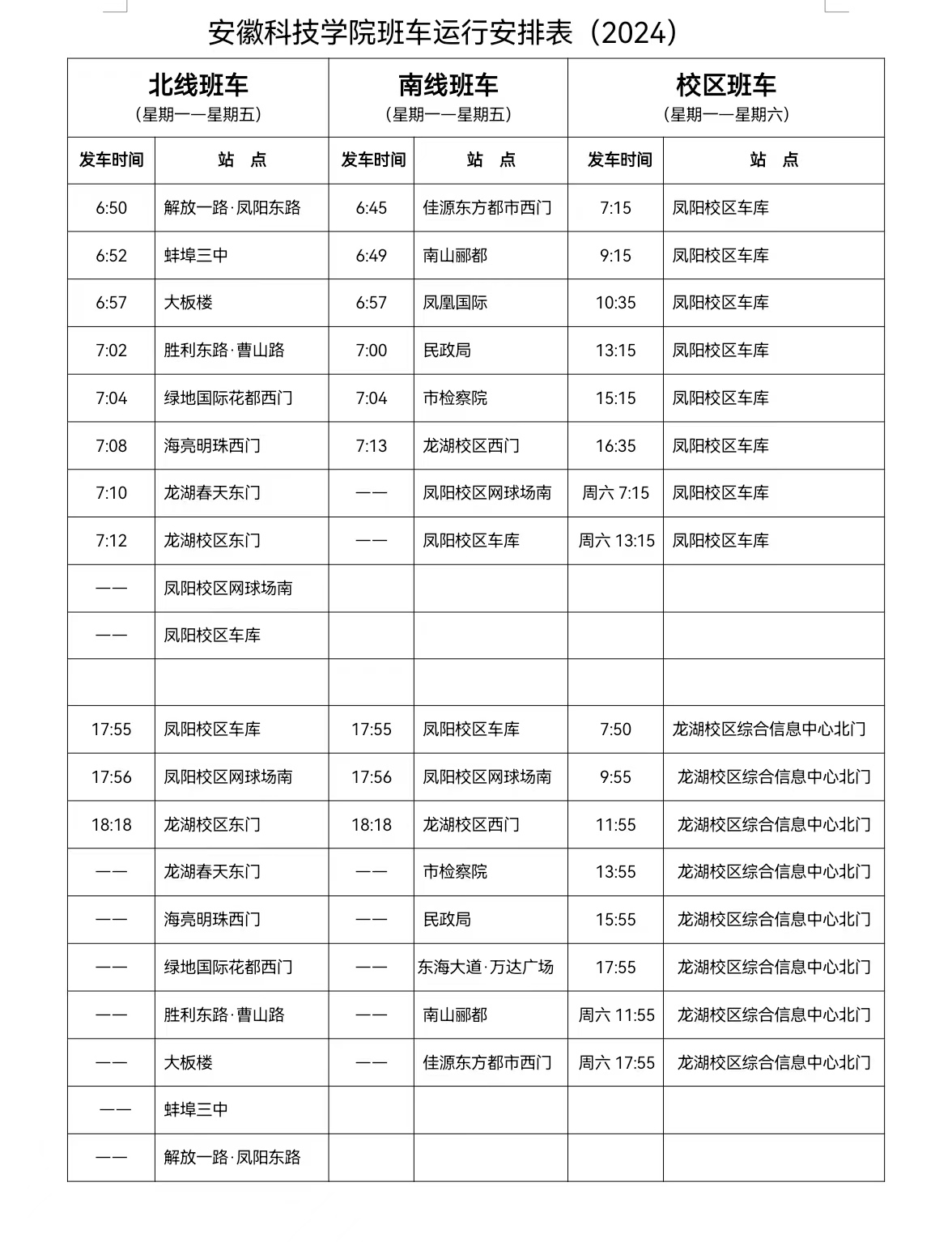 2.校区班车运行时间为:凤阳校区车库7:00、9:15、10:35、13:00、15:15、16:35;龙湖校区综合信息中心北门7:50、10:00、12:15、13:55、16:00、18:15。