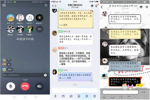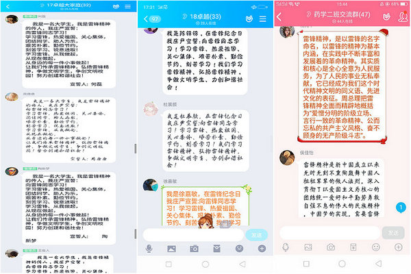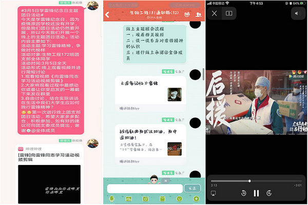 中药学172班、生物工程171、生物制药181、中药学191班等班级通过线上语音介绍雷锋生平事迹与阐述雷锋精神,同学们线上表达自己对雷锋精神的理解,班级官Q和易班微社区打卡等方式纪念雷锋同志。