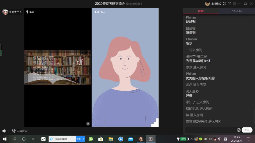 为浓厚考研氛围,帮助有意向考研同学了解考研过程,6月6日晚,管理学院通过QQ群课堂成功举办考研交流会。参加本次活动分享考研经验的嘉宾有成功考入中国矿业大学资产评估专业的刘雪莲、南京邮电大学管理科学与工程专业的刘梦茹、长安大学工商管理专业的高欣、武汉科技大学物流工程与管理专业的魏小蝶以及安徽工程大学管理科学与工程专业的张怀苗五位同学。