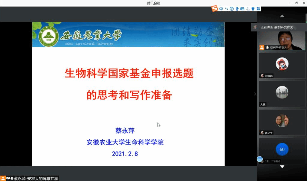 为进一步推进2021年度国家自然科学基金项目申报工作,推动学院科研工作再上新台阶,生命与健康科学学院于2月8日上午邀请国家自然基金评审专家、省学术和技术带头人、安徽农业大学党委研究生工作部部长、研究生院院长蔡永萍教授,以《生物学科国家基金申报选题的思考和写作准备》为题作线上专题讲座。此次讲座由生命与健康科学学院副院长钱立生主持,学院全体教师在线参与讲座。