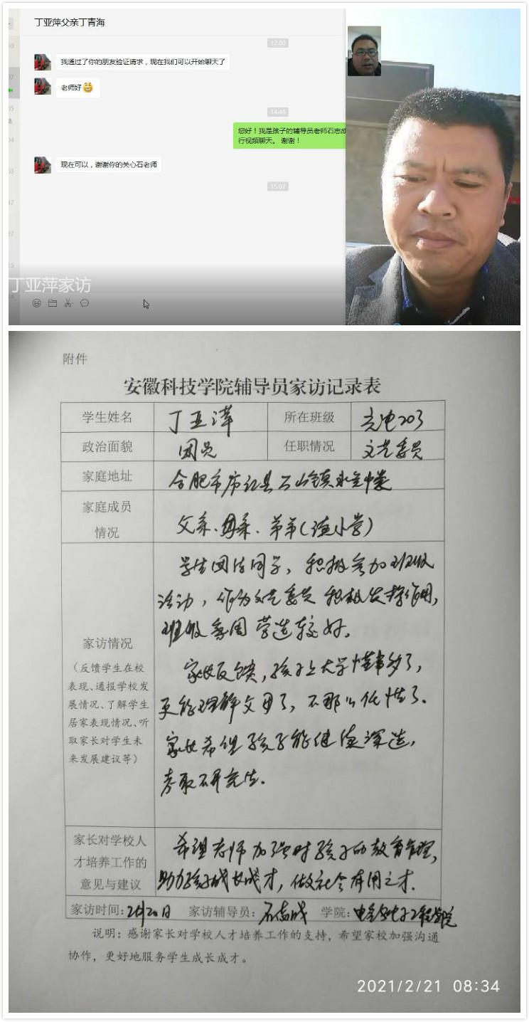 寒假还在继续,关爱从未缺席。根据学校《中国足彩网做好2021年寒假期间线上云家访活动的通知》文件要求,切实做好寒假期间学生思想政治教育工作,加强家校协同育人效果,电气与电子工程学院号召全体专兼职辅导员开展线上云家访活动。