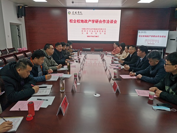 3月8日下午,安徽水利生态环境建设有限公司党支部书记余敦刚、副总经理李坤,蚌埠市市场监督管理局标准化科科长吴靖等一行7人应邀来校,参加政产学研合作洽谈会暨签约仪式。我校建筑学院院长张远兵、资源与环境学院院长李孝良以及课题组成员参加会议。会议由张远兵主持。