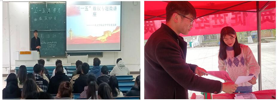 活动分为现场宣传和观影讲座两个部分。现场宣传主要通过悬挂横幅,邀请同学们在横幅上签字,深入学生寝室发放消费者权益保护宣传单,展出消费者权益保护宣传展板等方式开展。活动现场中,过往的同学们踊跃配合,积极签字。此外,法学学生党支部的学生党员们对前来咨询有关消费权益日问题的同学均予以耐心解答。